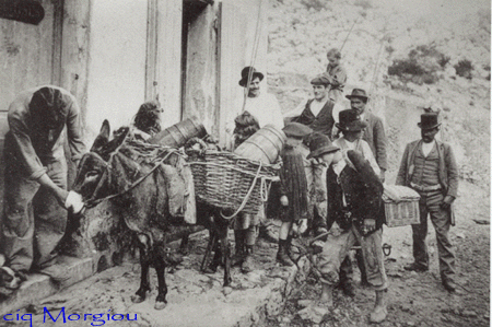 La fréquence des trajets du char à bancs est longue et l'impatience de se rendre au cabanon l'emporte souvent. Donc on marche avec tout le "barda" sur le dos et à bout de bras. Il faut penser à tout sinon il faut faire 6 km aller et 6 km retour si on a oublié le sel!!. (Il y a la mer à côté, c'est un mauvais exemple, mais vous avez certainement compris). Pour les grands festins l'aide des ânes et ânesses, appartenant en majeure partie aux pêcheurs, est indispensable.